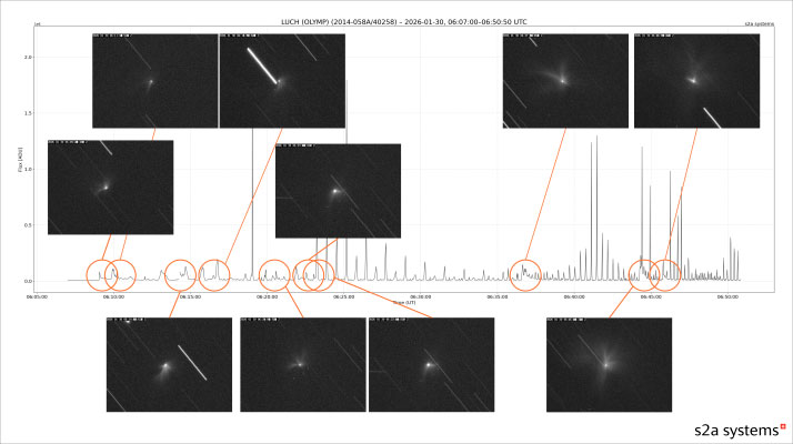 El satélite ruso Luch, también conocido como Olymp y catalogado como objeto 40258, mostró señales claras de fragmentación mientras estaba en una “órbita cementerio”, una órbita más alta usada para retirar satélites de la zona operativa geostacionaria. La secuencia fue registrada por redes de observación comercial: s2a systems reportó el inicio del evento a las 06:09:03 UTC del 30 de enero de 2026, seguido por la aparición de objetos cercanos y un aumento de giro del cuerpo principal. En sus imágenes se aprecia el rastro del satélite y puntos adicionales compatibles con fragmentos, lo que indica una ruptura con eyección de material. Este tipo de episodios en órbita alta es menos frecuente que en LEO, pero cuando ocurre complica la seguridad de un vecindario orbital del que dependen comunicaciones, meteorología y servicios críticos.