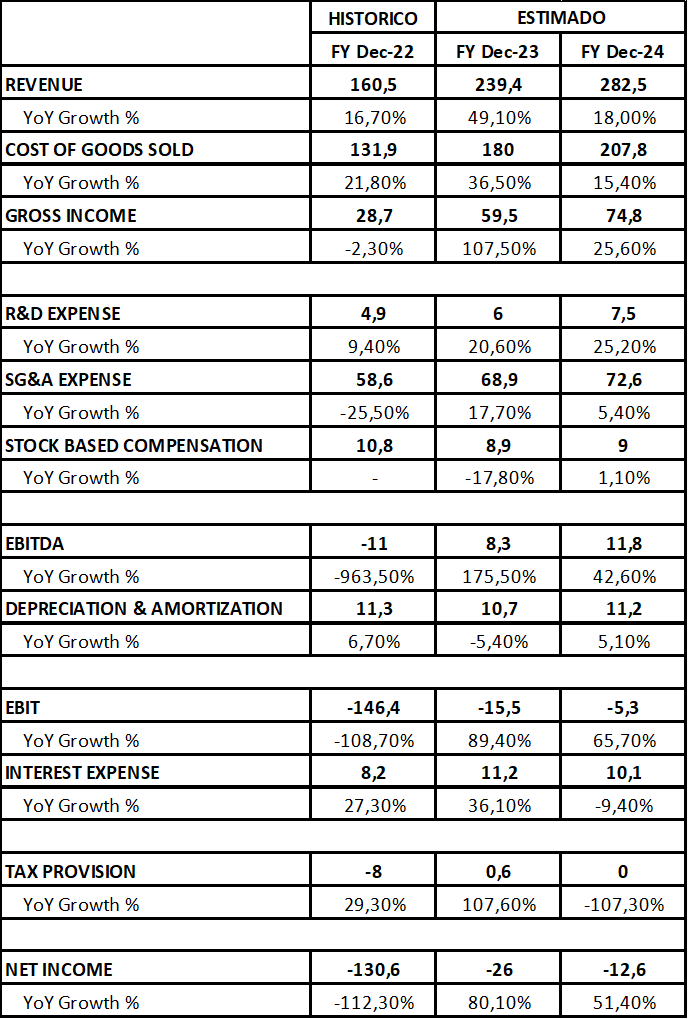 En base a ello, resulta procedente analizar con mayor detenimiento la posición económica y financiera de la firma. Para 2023, se proyecta una facturación de USD 239,4 millones lo que implica una suba del 49,1% en términos interanuales. A su vez, el margen bruto despega fuertemente y alcanza los USD 59,5 millones siendo poco más del doble que en la última presentación de resultados. Incluso, al observar la estructura de gastos, éstos se estiman crecerán menos que la tasa de aumento de las ventas permitiendo revertir el rojo de 2022.